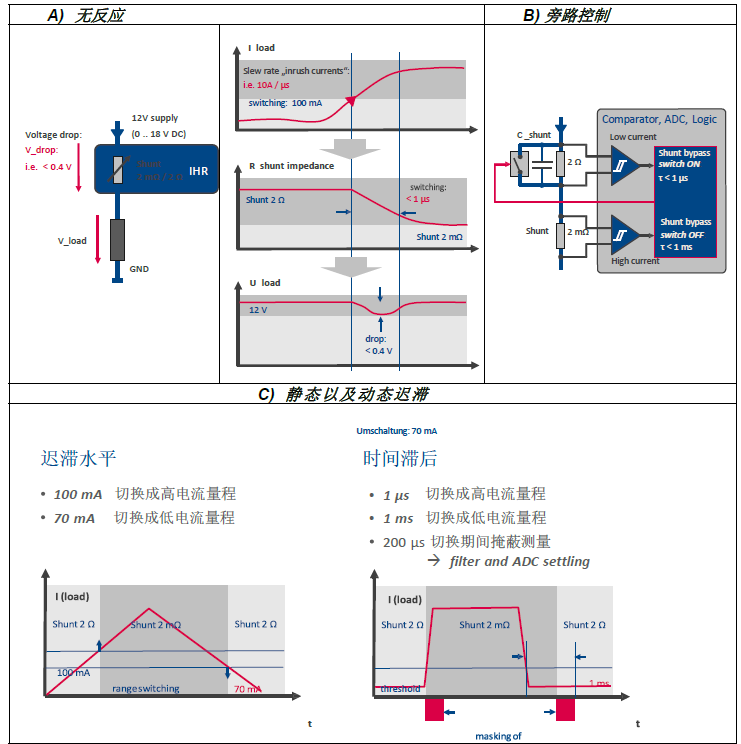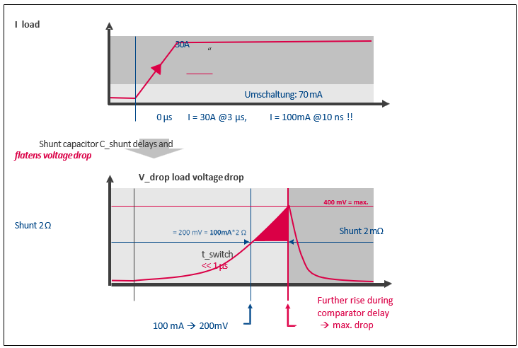 在實際的測量中,分流電阻切換響應必須要足夠快,如果電流突然增大,必須立即短接高阻抗分流電阻,不僅可以防止電路燒掉,同時也避免了負載電路中的負載電壓峰值。由于負載電路中的(瞬態(tài))壓降,會影響甚至斷開測試的負載組件。因此,分流電阻短接通過一個快速比較器控制,重新切換成高阻抗分流電阻會有延遲(圖6)。分流的快速啟用(<1us)以 及緩慢停用(<1ms)的遲滯水平(切換閾值)和時間滯后保證了安全和穩(wěn)定的狀態(tài)過渡。