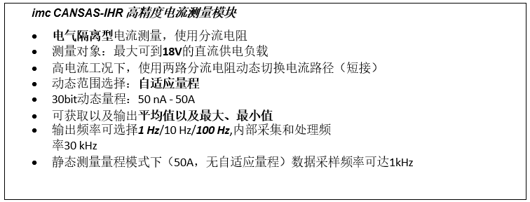 imc CANSAS-IHR 模塊基于上述理念設計,每個測量通道配置兩條電流測量路徑,實現量程自適應調節(jié),其供電電壓為9-18VDC。基于完全隔離設計,該測量模塊可
